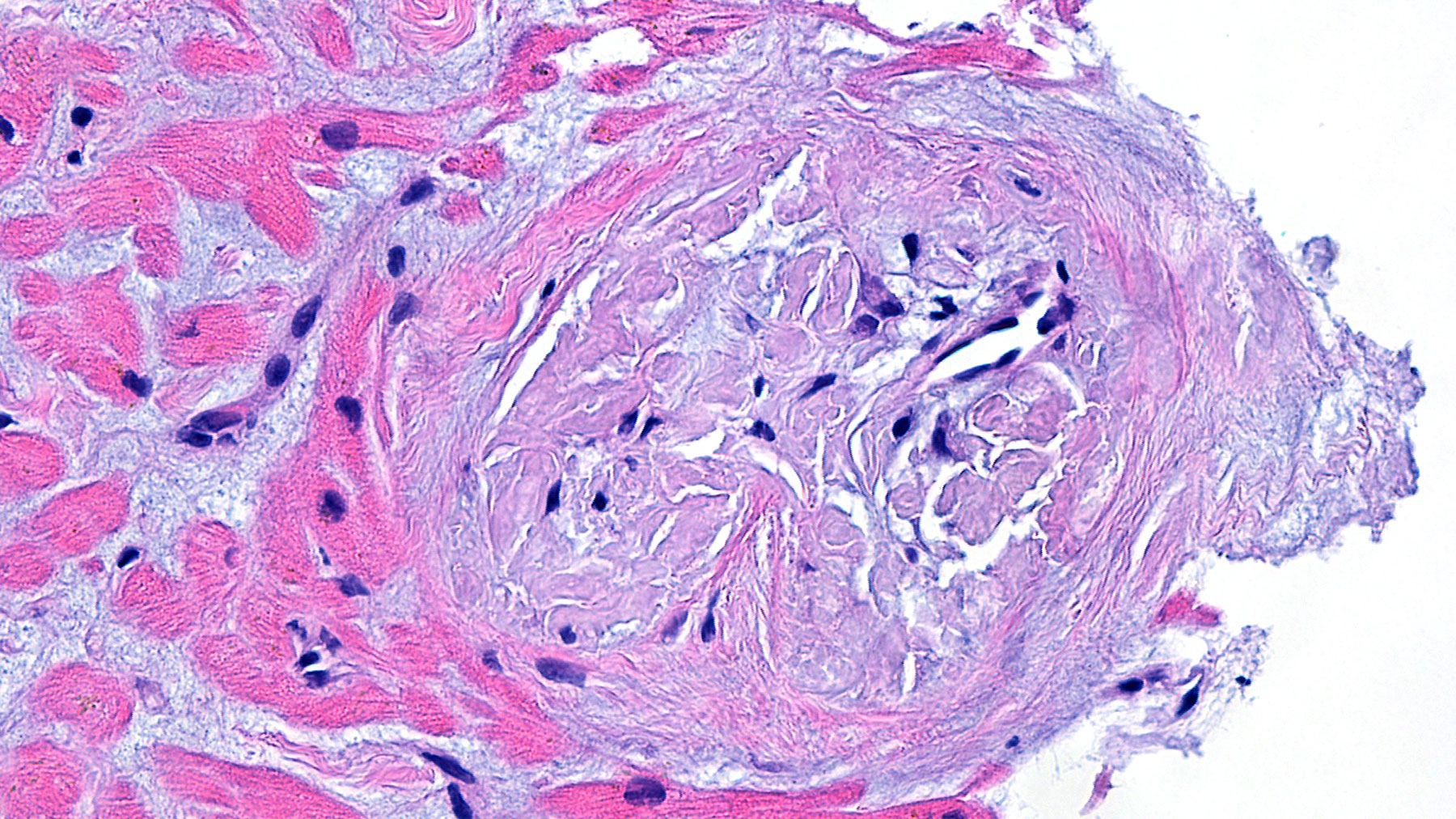 cardiomyocytes and vascular structures surrounded by a fibrillary material