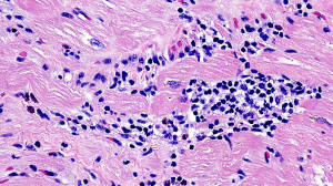 mild to moderate infiltration of interstitial spaces with mononuclear