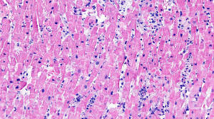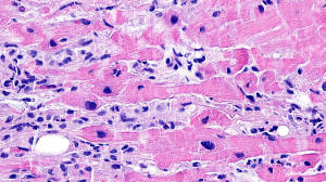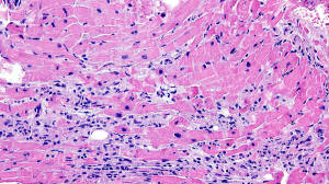 predominant interstitial edema and lymphocytic infiltration with myocyte